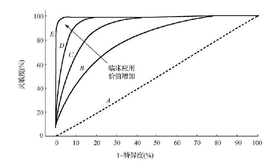 | 一、ROC曲線簡介 1.什么是ROC曲線 ROC曲線即受試者工作特征曲線(receiver operator characteristic curve,ROC),又稱為感受性曲線(sensitivity curve),是反映靈敏度和特異度連續(xù)變量的綜合指標(biāo),通常被用來直觀地確定某一種診斷方法(診斷試劑、診斷設(shè)備)的最優(yōu)診斷界值,即取靈敏度和特異度之和最大的截點(diǎn),盡量靠近曲線左上方的點(diǎn)。也可以用來對同一種疾病兩種以上的診斷方法的臨床應(yīng)用價(jià)值進(jìn)行粗略的比較評價(jià)。 傳統(tǒng)的ROC曲線解決的是“是”或“否”的問題,可以根據(jù)醫(yī)師對讀片結(jié)果類型的不同,分成二分類法和多等級法?紤]到在影像學(xué)中的應(yīng)用,除了判斷是不是病灶,還要考慮病灶所在的位置,以及是單發(fā)病灶還是多發(fā)病灶,需要對病灶進(jìn)行定性、定位、定量診斷,因此衍生出LROC(location-response operating characteristic)、FROC(free-response operating characteristic)、AFROC(alternative FROC)。 2.ROC曲線的繪制 由于醫(yī)師自身的學(xué)習(xí)背景、工作經(jīng)驗(yàn)等多方面存在差異,對影像學(xué)設(shè)備成像的讀片也有自己的尺度,即不同的醫(yī)師會有不同的診斷界值。根據(jù)不同的診斷界值對多幅影像做出診斷,并與金標(biāo)準(zhǔn)相對照,可分別計(jì)算出靈敏度和特異度。根據(jù)診斷界值從低到高取若干個(gè)截?cái)帱c(diǎn)(至少5組),逐個(gè)計(jì)算相應(yīng)的靈敏度(真陽性率)、特異度(真陰性率),以靈敏度為縱坐標(biāo),1-特異度(假陽性率)為橫坐標(biāo),標(biāo)出各工作點(diǎn),然后連接各點(diǎn)繪制而成的曲線。一般情況下,ROC曲線均處于(0,0)和(1,1)連線的上方,選取的工作點(diǎn)越多,曲線越平滑。 3.ROC曲線的應(yīng)用 ROC曲線主要有三方面應(yīng)用。首先,ROC曲線可以直觀地反映診斷方法的靈敏度和特異度;其次,也是最常用的,通過計(jì)算ROC曲線下面積(area under roc curve,AUC),對多個(gè)器械的臨床應(yīng)用價(jià)值進(jìn)行比較,是一個(gè)客觀直觀的指標(biāo)。如下圖的B-E四種影像設(shè)備的ROC曲線,E的AUC最大,臨床應(yīng)用價(jià)值最高。ROC曲線下面積的計(jì)算通?梢圆捎秒p正態(tài)參數(shù)法和非參數(shù)法進(jìn)行計(jì)算,這兩種方法計(jì)算的曲線下面積及其方差十分相近,所以在實(shí)際應(yīng)用中不必過分要求數(shù)據(jù)符合正態(tài)分布。最后,是曲線下部分面積,當(dāng)兩個(gè)器械的ROC曲線并不像圖中那樣,而是出現(xiàn)交叉時(shí),由于曲線下面積不能反映某一范圍內(nèi)的靈敏度與特異度優(yōu)劣,甚至可能會得出相反的結(jié)論,所以利用曲線下部分面積進(jìn)行比較,才能反映真實(shí)情況。 二、ROC曲線在影像學(xué)設(shè)備中的應(yīng)用 ROC曲線在影像學(xué)設(shè)備中應(yīng)用很多。 第一,可以根據(jù)曲線選擇診斷界值,達(dá)到最優(yōu)的靈敏度和特異度,使器械發(fā)揮最佳的效果,也可以通過曲線下面積判斷設(shè)備的成像質(zhì)量,通常0.9及以上的成像效果佳,0.7~0.9成像效果中等,0.5~0.7成像效果較低。這一應(yīng)用多體現(xiàn)在產(chǎn)品生命周期的設(shè)計(jì)開發(fā)階段,如深度學(xué)習(xí)輔助決策AI影像學(xué)軟件在設(shè)計(jì)開發(fā)過程中通過不同診斷界值的選擇,使軟件達(dá)到最優(yōu)的靈敏度特異度組合,發(fā)揮最大臨床應(yīng)用價(jià)值。 第二,是通過AUC來評判器械的變更。如某一影像設(shè)備在做影響到臨床應(yīng)用的許可事項(xiàng)變更時(shí),對于臨床應(yīng)用價(jià)值變化或成像質(zhì)量的判斷,可以通過變更前和變更后的各自AUC進(jìn)行比較。若AUC變大,或變化在科學(xué)合理的范圍內(nèi),則可以判定該許可事項(xiàng)變更臨床應(yīng)用相關(guān)部分是合格的。 第三,對不同影像設(shè)備的成像質(zhì)量進(jìn)行比較。通過計(jì)算AUC的大小,來評價(jià)兩種或多種同類型影像設(shè)備的臨床應(yīng)用價(jià)值的大小或成像質(zhì)量的優(yōu)劣。通過計(jì)算曲線下部分面積,也可以判斷在某一靈敏度、特異度范圍內(nèi)不同影像設(shè)備的臨床應(yīng)用價(jià)值或成像質(zhì)量。 除以上應(yīng)用外,ROC曲線還可以評價(jià)不同診斷醫(yī)師的診斷效能。值得注意的是,在應(yīng)用ROC曲線時(shí),病例的選擇和干擾因素的控制關(guān)系到是否能得到客觀真實(shí)的結(jié)論。 |