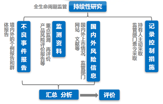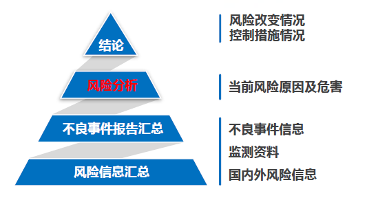 3、評價 對風(fēng)險信息的匯總; 對不良事件監(jiān)測信息進(jìn)行的分析 對其他風(fēng)險信息的綜合 對上市后風(fēng)險的評價:風(fēng)險是否有變化、是否可接受 4、報告 報告應(yīng)當(dāng):完整、規(guī)范化;有邏輯結(jié)構(gòu)(介紹、數(shù)據(jù)、分析、結(jié)論);可識別(日期、版本、注冊人與聯(lián)系人等);