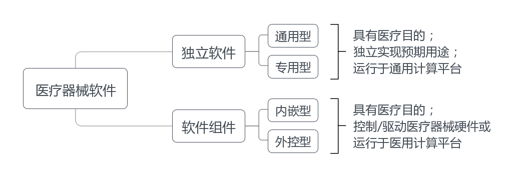 醫(yī)療器械軟件包括本身即為醫(yī)療器械的軟件或者醫(yī)療器械內(nèi)含的軟件,前者即醫(yī)療器械獨立軟件(簡稱獨立軟件),后者即醫(yī)療器械軟件組件(簡稱軟件組件)。 獨立軟件(SaMD)是指具有一個或多個醫(yī)療目的/用途,無需醫(yī)療器械硬件即可完成自身預期用途,運行于通用計算平臺的軟件;軟件組件(SiMD)是指具有一個或多個醫(yī)療目的/用途,控制/驅(qū)動醫(yī)療器械硬件或運行于醫(yī)用計算平臺的軟件。 獨立軟件作為醫(yī)療器械或醫(yī)療器械附件,通常單獨注冊,特殊情況可隨醫(yī)療器械進行注冊,此時雖不控制/驅(qū)動醫(yī)療器械硬件但從產(chǎn)品角度運行于醫(yī)用計算平臺,故視為軟件組件,如專用型獨立軟件可作為附件隨醫(yī)療器械進行注冊。 軟件組件作為醫(yī)療器械或醫(yī)療器械部件、附件的組成部分,不宜單獨注冊,需隨醫(yī)療器械進行整體注冊。